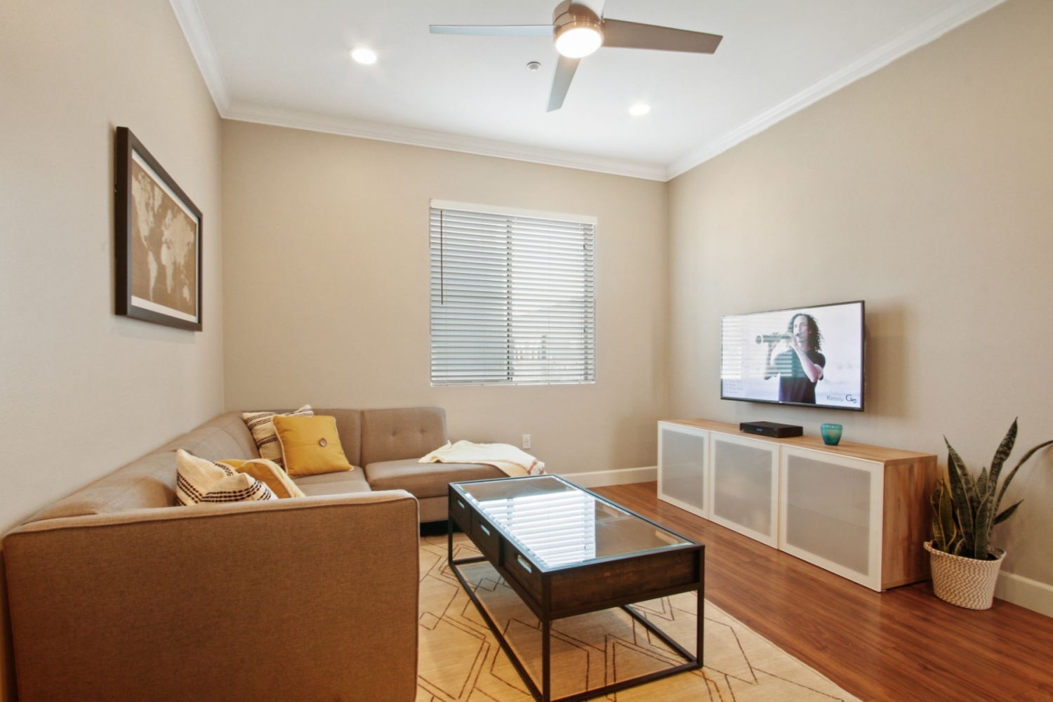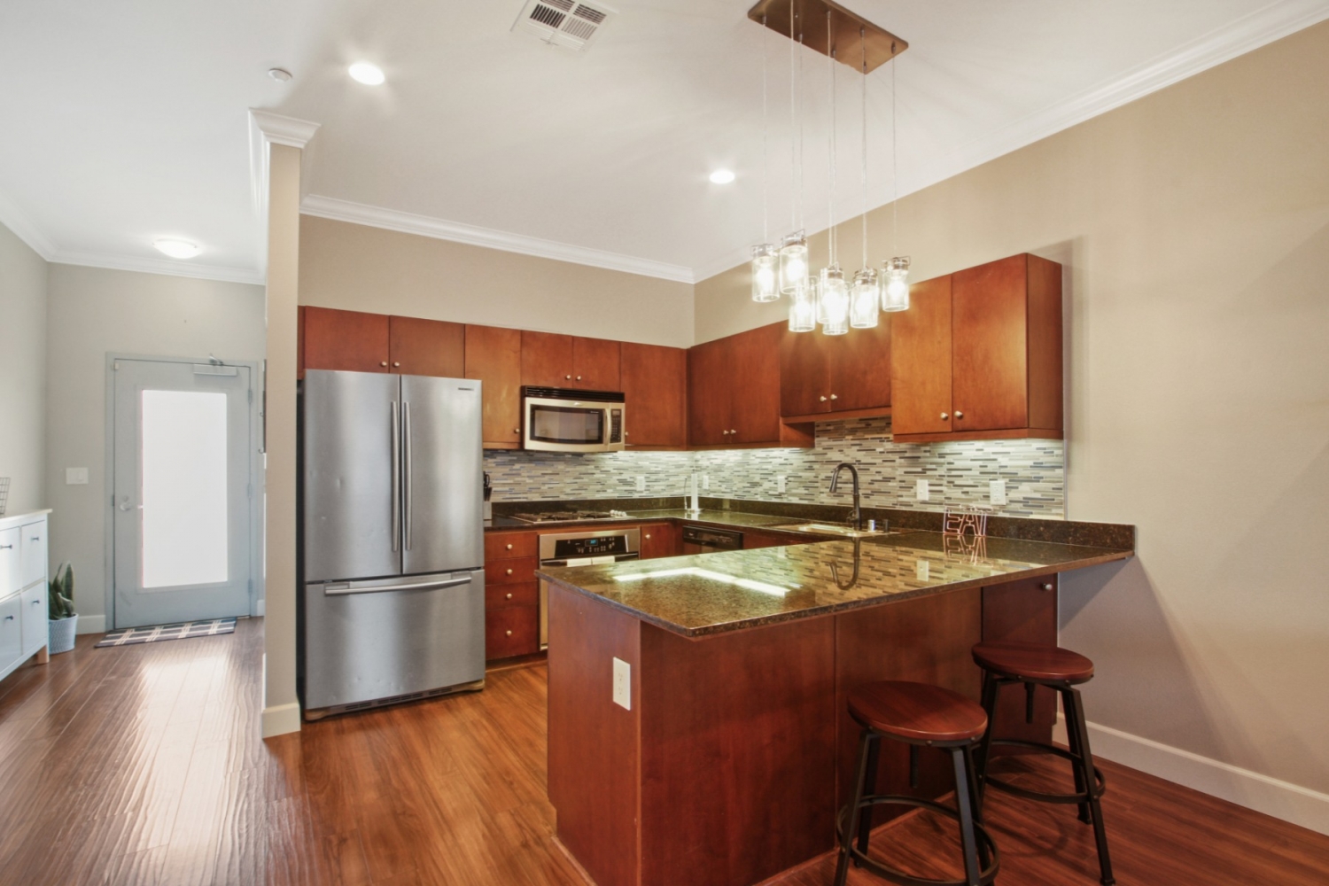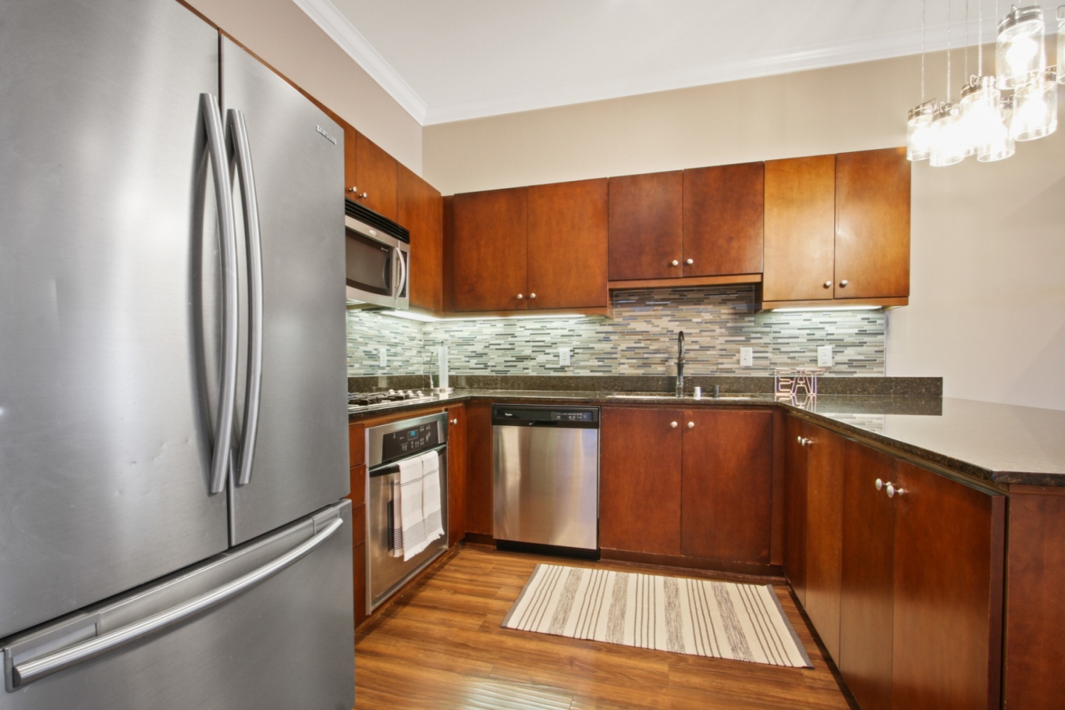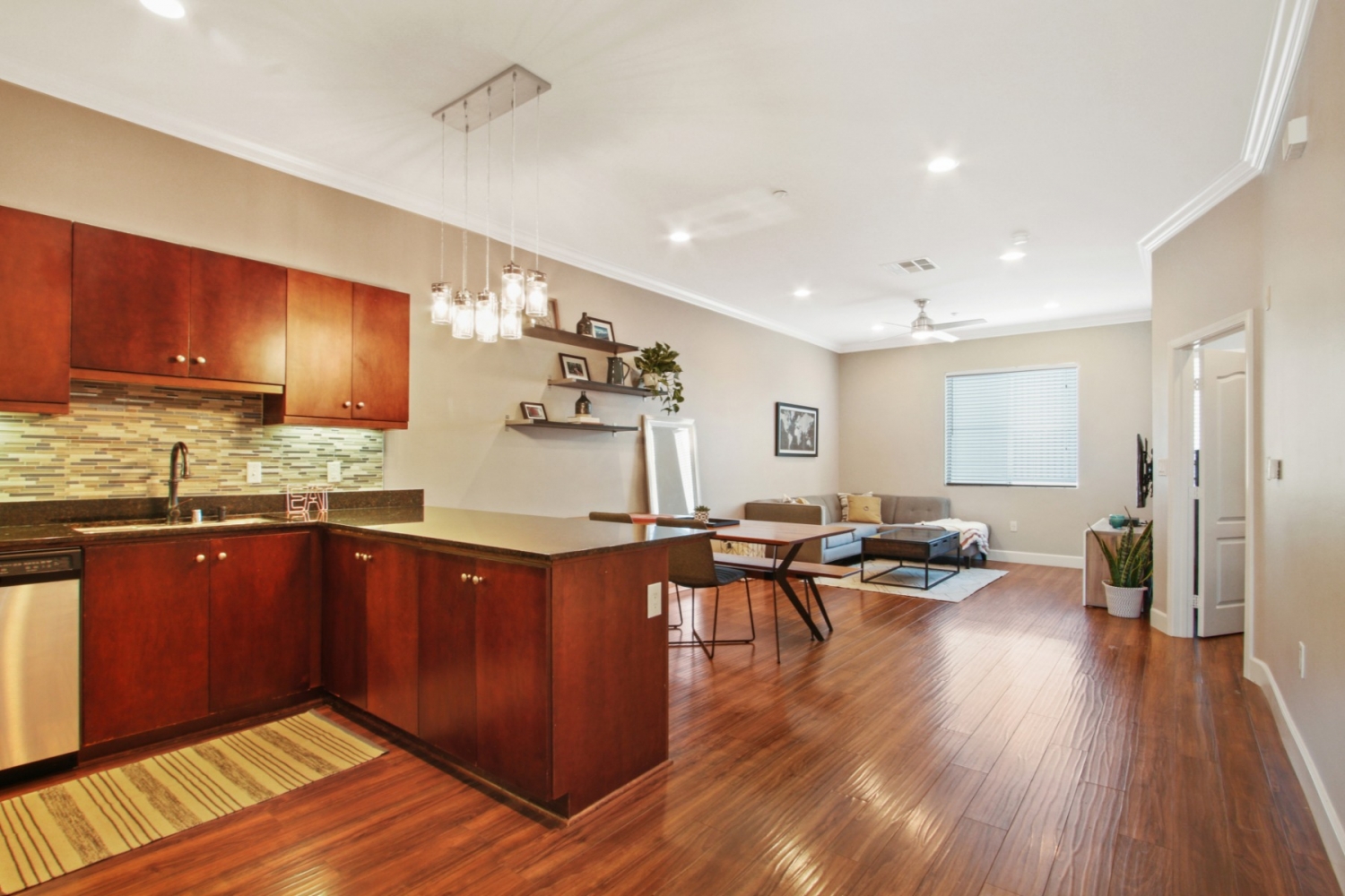 Location, Location! This Stunning Modern Harbor Lofts 2 bed 2 full bath Penthouse is in a Rare Corner End Unit location with only one shared wall. Convenient Prime Location in the Anaheim Colony Historic District by the Packing House, Garden Walk, the Anaheim Ice Rinks, and much more right outside your door! Virtual Walk-Through Tour Link: https://bit.ly/3b9MUKU As you enter you are immediately welcomed by beautiful Laminate Wood Floors and Soaring High Ceilings across the Open Great Room spanning the full length of the building from the Gorgeous Kitchen, through the dining, and into the Family/Living Room. The Spacious Kitchen is well equipped with sleek granite counter tops, glass tile back-splash, dark wood cabinets, stainless steel appliances, and a breathtaking 8-light cluster cylinder pendant above the large peninsula. Upgrades throughout include Crown Molding, Tall Baseboards, Ceiling Fans, recessed LED lighting, Wi-Fi Smart Dimmer Switches, USB wall outlets, Laminate flooring, and much more! The Convenient indoor laundry closet includes a full-size washer and dryer. The Secure Gated 2-car end unit parking spots are in the lower Parking Garage right next to the elevator. The Harbor Lofts Community offers a resort-style pool and spa area with loungers, couches, large umbrellas, tables, chairs, and BBQs on the same level as a gym and weight equipment. Enjoy the Many Great nearby entertainment options and being close to the I-5 and 91 freeways, FRAN, and Disneyland!