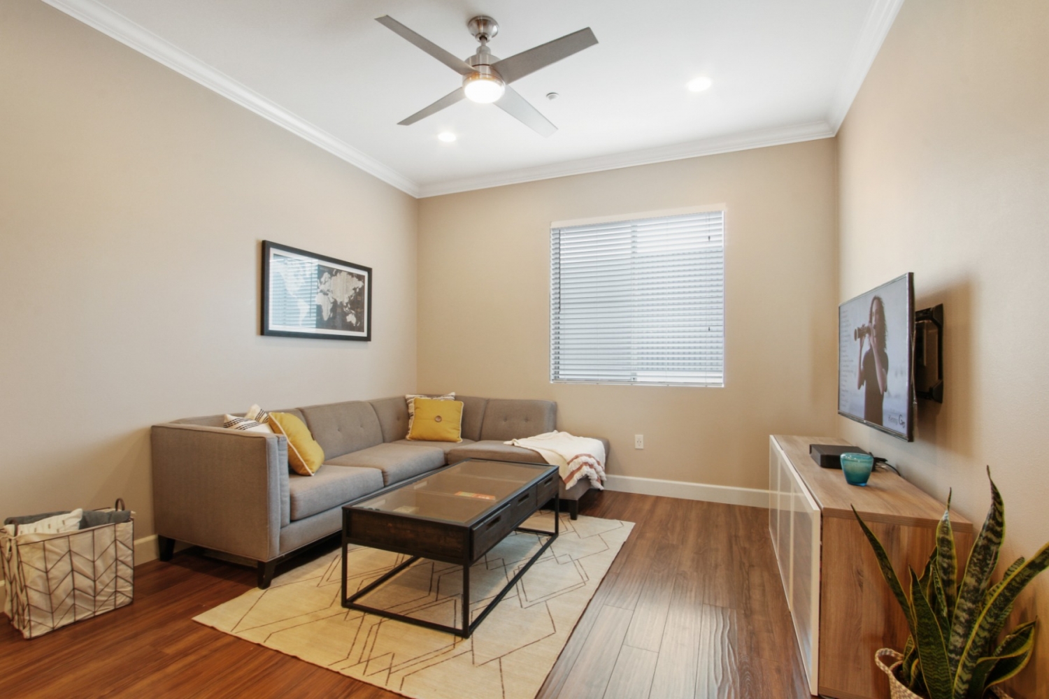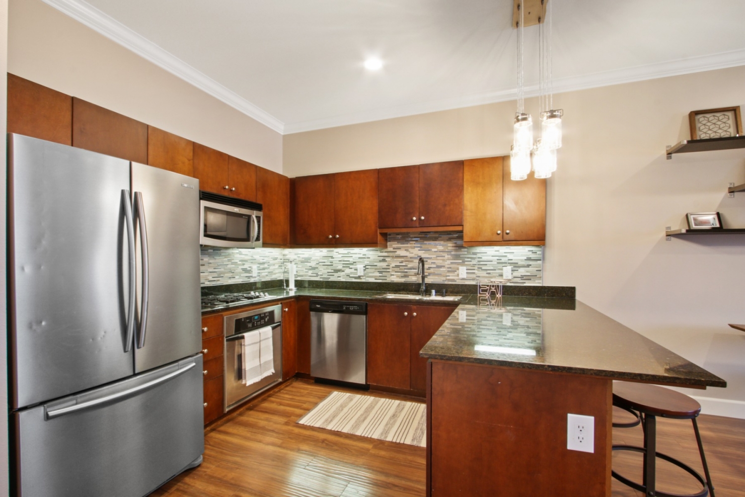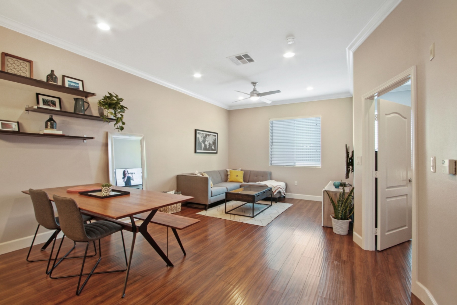 Location, Location! This Stunning Modern Harbor Lofts 2 bed 2 full bath Penthouse is in a Rare Corner End Unit location with only one shared wall. Convenient Prime Location in the Anaheim Colony Historic District by the Packing House, Garden Walk, the Anaheim Ice Rinks, and much more right outside your door! Virtual Walk-Through Tour Link: https://bit.ly/3b9MUKU As you enter you are immediately welcomed by beautiful Laminate Wood Floors and Soaring High Ceilings across the Open Great Room spanning the full length of the building from the Gorgeous Kitchen, through the dining, and into the Family/Living Room. The Spacious Kitchen is well equipped with sleek granite counter tops, glass tile back-splash, dark wood cabinets, stainless steel appliances, and a breathtaking 8-light cluster cylinder pendant above the large peninsula. Upgrades throughout include Crown Molding, Tall Baseboards, Ceiling Fans, recessed LED lighting, Wi-Fi Smart Dimmer Switches, USB wall outlets, Laminate flooring, and much more! The Convenient indoor laundry closet includes a full-size washer and dryer. The Secure Gated 2-car end unit parking spots are in the lower Parking Garage right next to the elevator. The Harbor Lofts Community offers a resort-style pool and spa area with loungers, couches, large umbrellas, tables, chairs, and BBQs on the same level as a gym and weight equipment. Enjoy the Many Great nearby entertainment options and being close to the I-5 and 91 freeways, FRAN, and Disneyland!